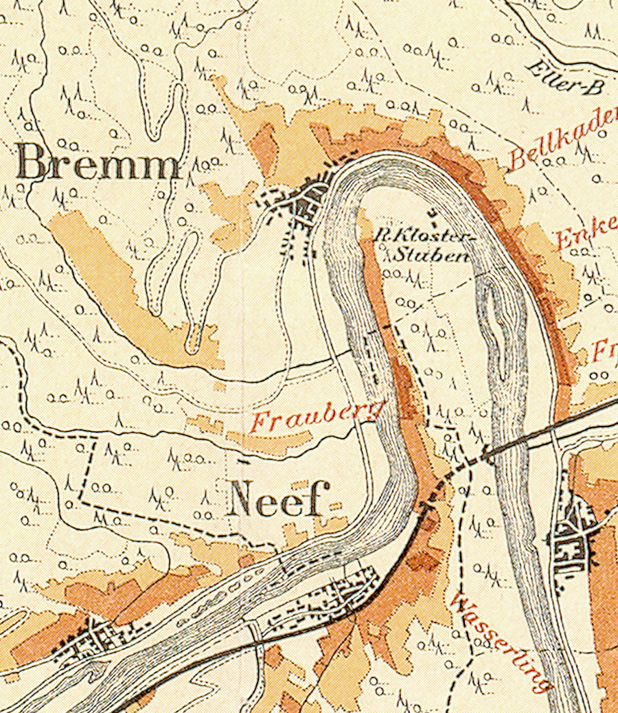 Bremm mit seinen Lagen. Ausschnitt aus der historischen Mosel-Weinbau-Karte für den Regierungsbezirk Koblenz aus dem Jahre 1897.