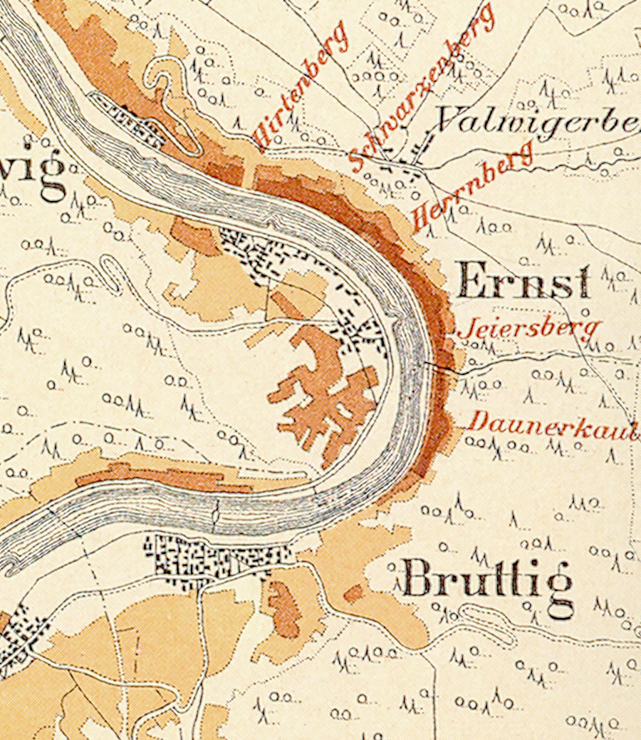 Bruttig mit seinen Lagen. Ausschnitt aus der historischen Mosel-Weinbau-Karte für den Regierungsbezirk Koblenz aus dem Jahre 1897.