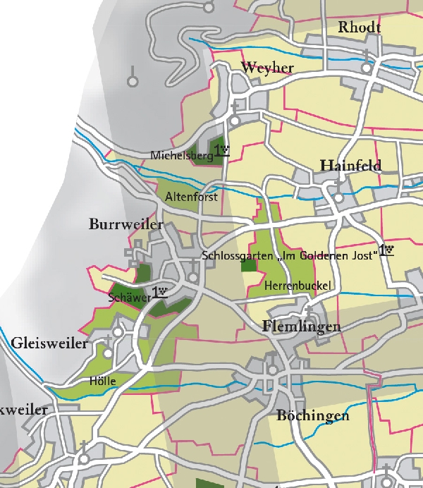 Heute erinnert lediglich ein Sandstein-Torbogen an das einstige Adelsgeschlecht. Inmitten dieser renommierten Lage liegt auf 185 m über NN ein etwa 4 Hektar großes Stück mit dem alten Gewannen-Namen „Im goldenen Jost“. Durch die Neigung in südlicher Richtung, strahlt die Sonne hier den ganzen Tag ein und sorgt so für eine optimale Erwärmung. Der Boden zeichnet sich durch tiefgründigen, sandigen Lehm mit hohem Kalkanteil und einem optimalen Wasserhaushalt aus.