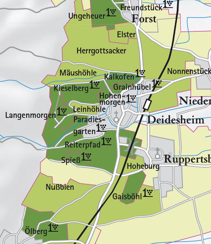 • Die Abbildung zeigt den Ort Deidersheim mit seinen Ersten Lagen. Ausschnitt aus der Lagenkarte Pfalz | Mittelhaardt. Kartografie: „Weinatlas Deutschland“, erschienen im HALLWAG Verlag mit freundlicher Genehmigung der GRÄFE und UNZER VERLAG GmbH, München. Stand 2009.