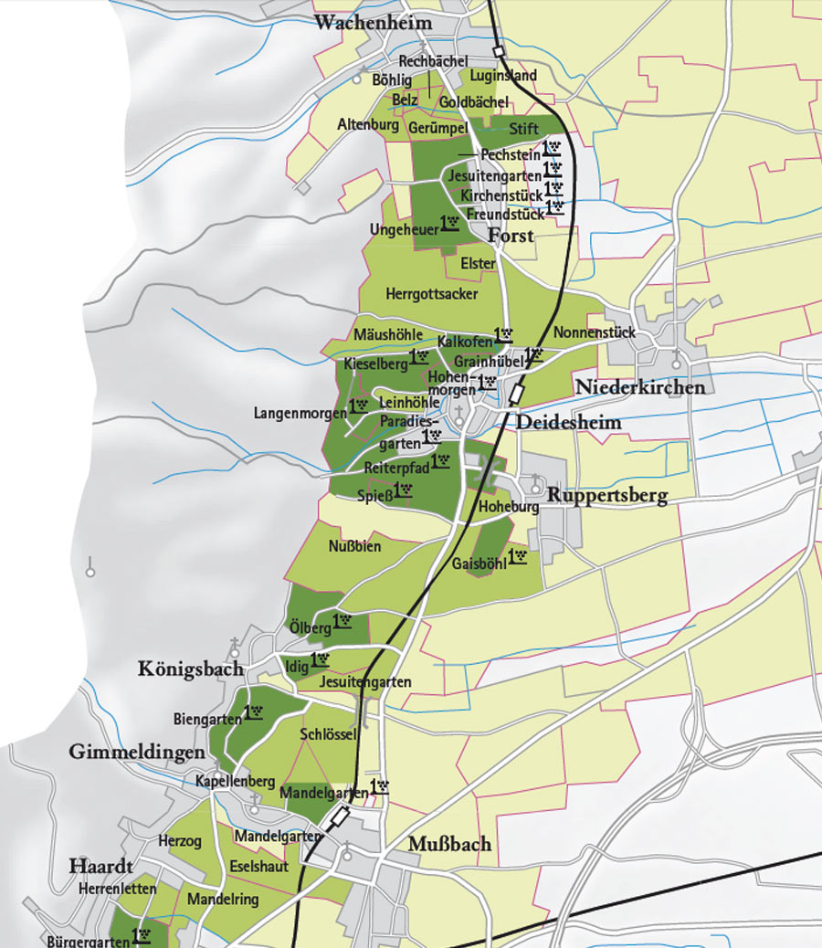• Die Abbildung zeigt die Region um die Orte Deidersheim,Ruppertsberg, Gimmeldingen und Königsbach mit ihren Ersten Lagen. Ausschnitt aus der Lagenkarte Pfalz | Mittelhaardt.