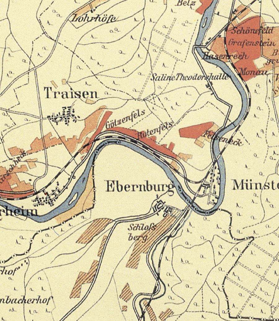 Ebernburg mit seinen Lagen. Ausschnitt aus der historischen Nahe-Weinbau-Karte für den Regierungsbezirk Koblenz aus dem Jahre 1901.