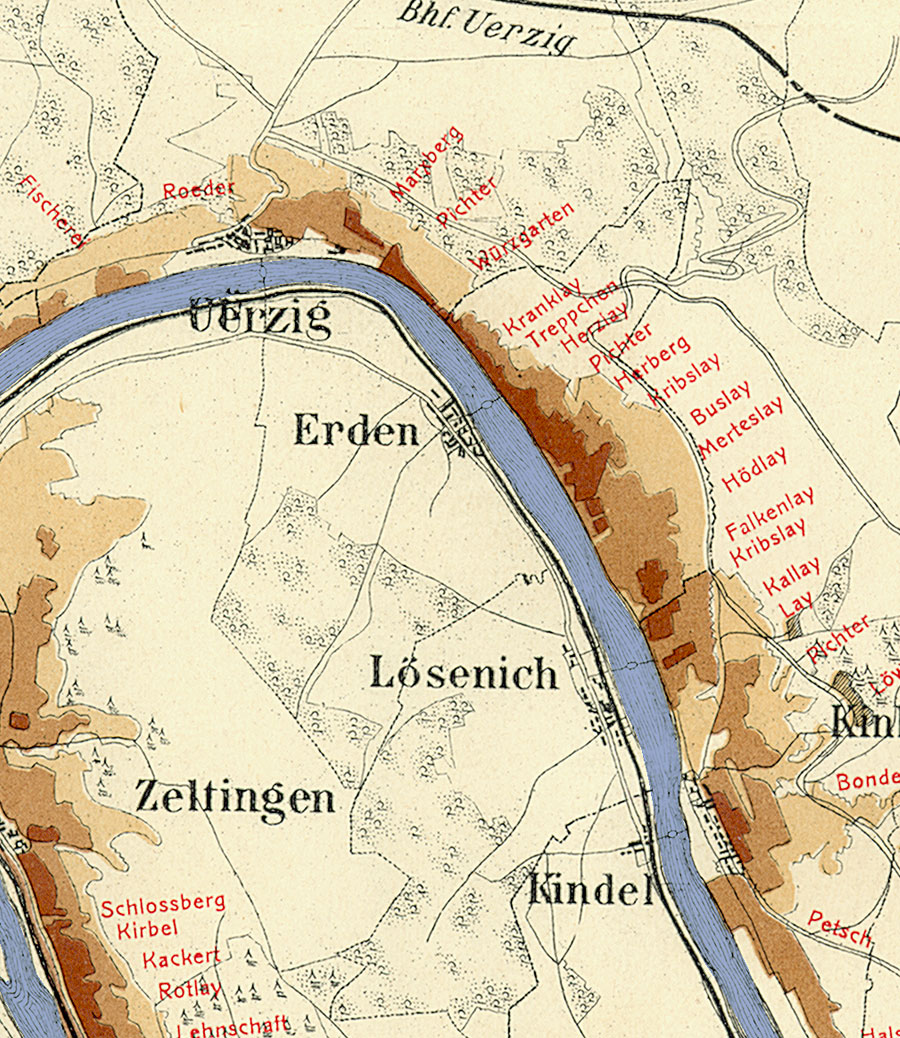Die Abbildung zeigt die Umgebung des Ortes Erden mit seinen Lagen. Aus der historischen Mosel-Weinbau-Karte für den Regierungsbezirk Trier aus dem Jahre 1906.