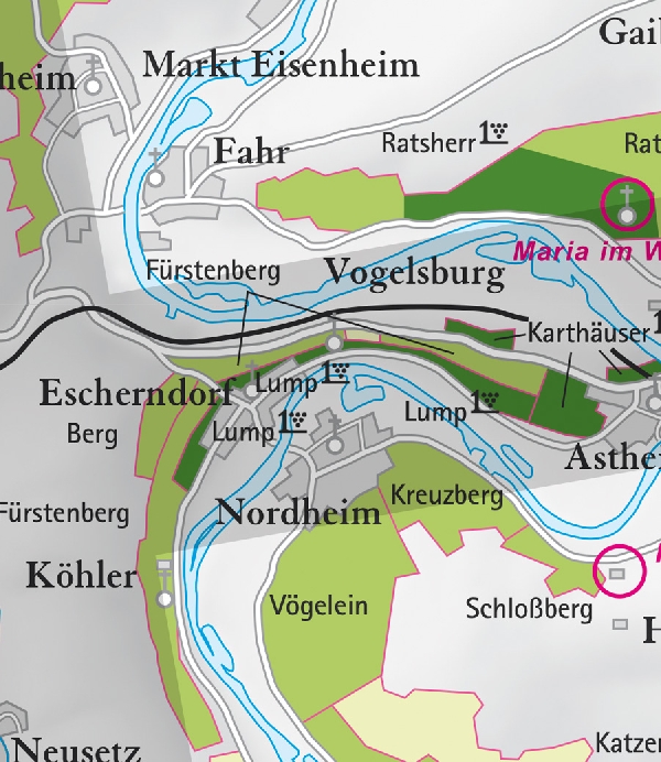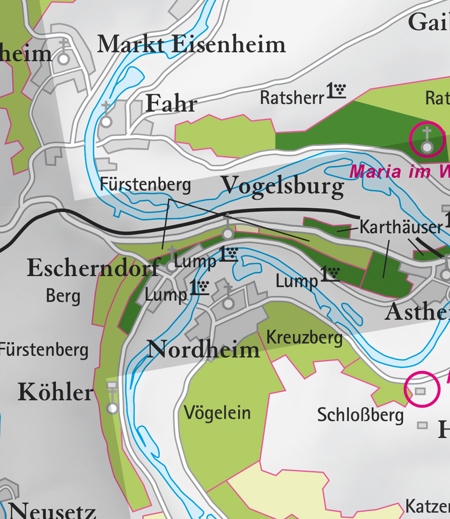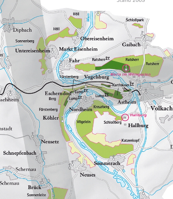 • Die Abbildung zeigt den Ort escherndorf und seine Umgebung mit ihren Ersten Lagen. Ausschnitt aus dem Weinatlas Deutschland. Stand 2009.