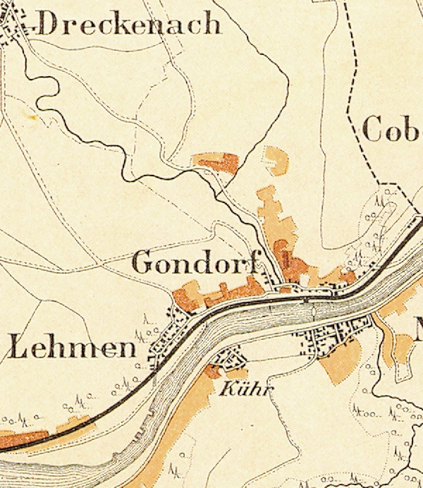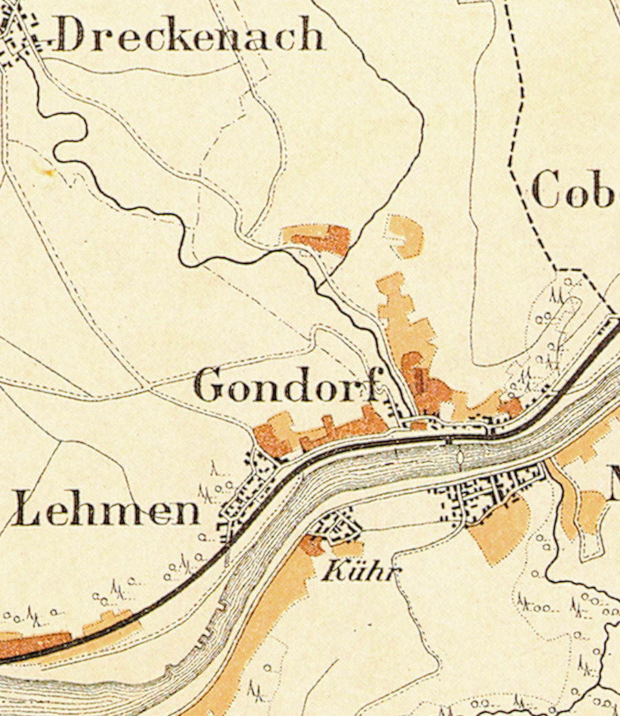 Gondorf mit seinen Lagen. Ausschnitt aus der historischen Mosel-Weinbau-Karte für den Regierungsbezirk Koblenz aus dem Jahre 1897.