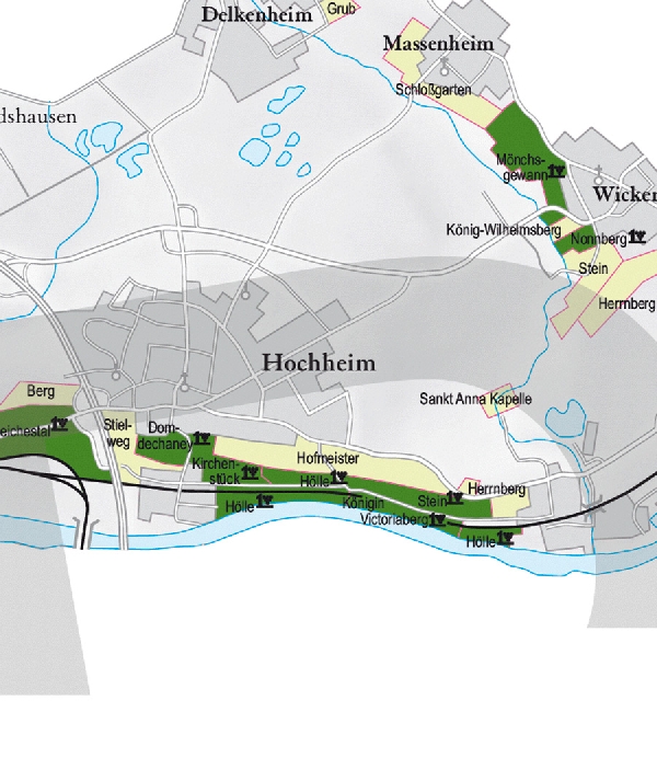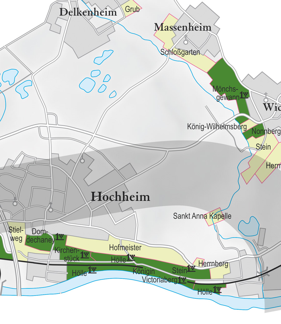 • Die Abbildung zeigt den Ort hochheim mit seinen Ersten Lagen. Ausschnitt aus dem Weinatlas Deutschland. Stand 2009.