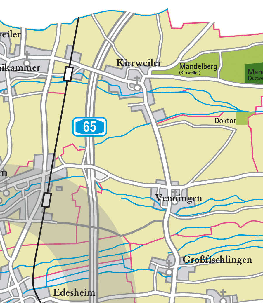 Diese haben meist eine Höhe von 120-150m NN und sind beidseits parallel von Bachtälern begrenzt. Geologen bezeichnen diese Landschaftsform als Riedel. Die Weinlage Kirrweiler Mandelberg liegt auf der Südseite eines solchen Riedels. Während der letzten Eiszeit vor ca. 20.000 Jahren entstanden im Mandelberg Lößablagerungen. Der Löß ist ein vom Wind herangetragener kalkhaltiger Quarzstaub, der den vorhandenen Sand oder Lehm unterschiedlich stark überzieht. Kalkhaltige Böden sind eine Voraussetzung für große Burgunderweine. Die Burgunder aus dem Mandelberg wirken elegant und harmonisch, eher fein strukturiert aber mit saftigem langen Nachhall. VDP klassifizierte Lage, Auszug aus dem Katalog der VDP-Klassifikation.
