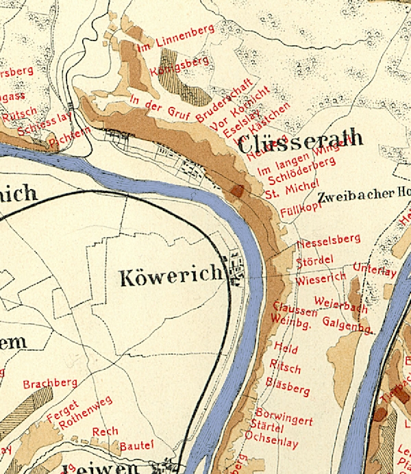 Klüsserath mit seinen Lagen. Ausschnitt aus der historischen Mosel-Weinbau-Karte für den Regierungsbezirk Trier aus dem Jahre 1868.