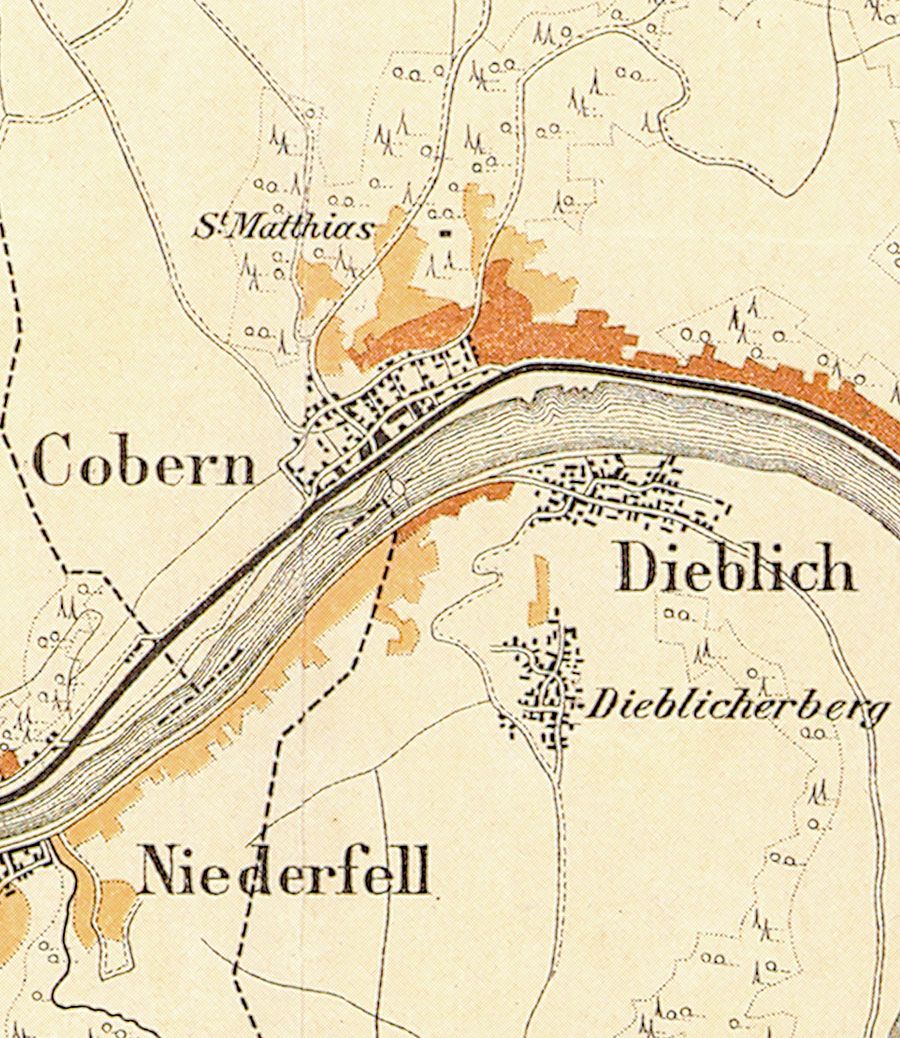 Kobern mit seinen Lagen. Ausschnitt aus der historischen Mosel-Weinbau-Karte für den Regierungsbezirk Koblenz aus dem Jahre 1897.