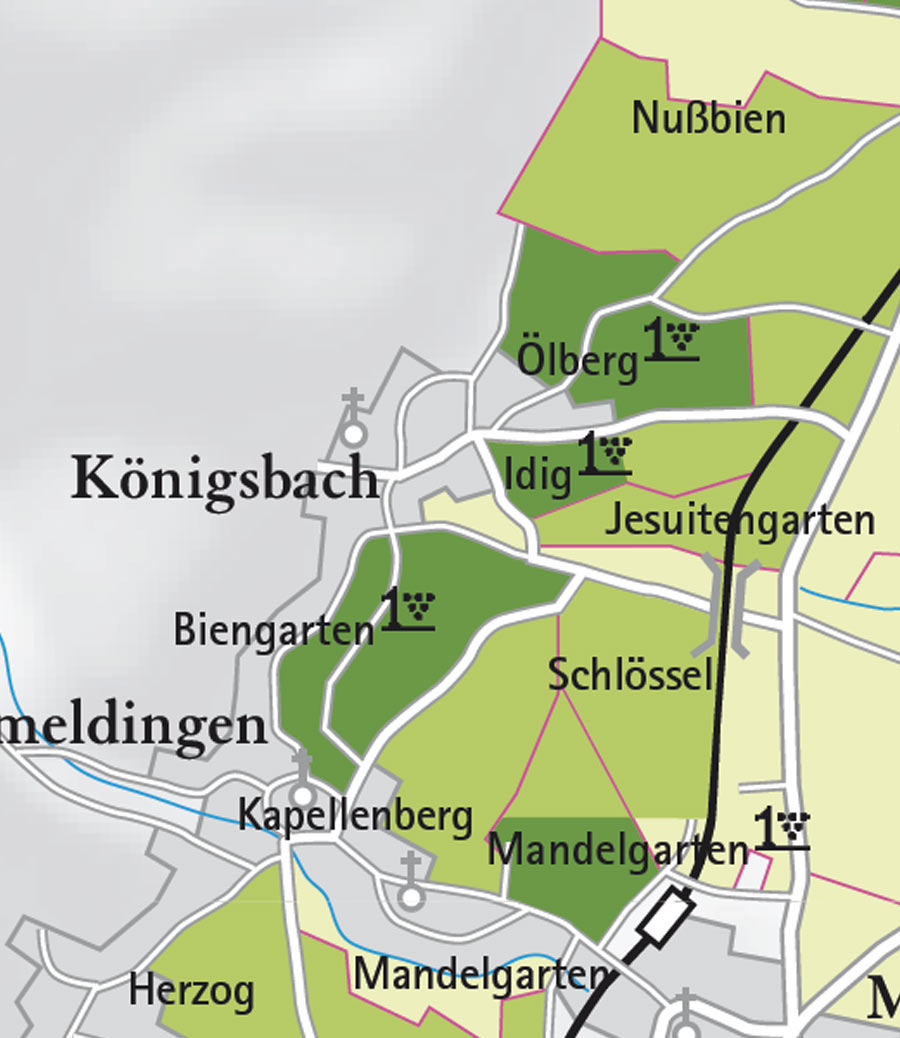 Seinen etwas seltsam anmutenden Namen hat der Weinberg von der Inschrift eines Feldkreuzes I D, für Jesus Domini, was ihn als “Stück des Herren” auswies. Eine Besonderheit stellt der für Pfälzer Verhältnisse steile Südhang dar, der nach Westen gut abgeschirmt und so vor Kaltluft geschützt ist. So bildet er einen Kessel, der höchste Temperaturen aufweist. Der Boden des Idig ist von den unzähligen Kalksteinen geprägt. Aus ihnen bildete sich ein kräftiger Mergelboden. Klima und Boden prägen die Idig-Weine und zeichnen sie nicht nur als Herkunft für den Riesling, sondern auch für den Spätburgunder aus. Erst nach einer gewissen Lagerzeit entwickeln die Riesling-Weine ihre volle Eleganz. Sie sind dabei fruchtig und extrem komplex. Sie haben abgeschliffene Fruchtsäure und wirken niemals sauer. Auch die Spätburgunder aus dem Idig benötigen ein langes Fass- und ein noch längeres Flaschenlager.