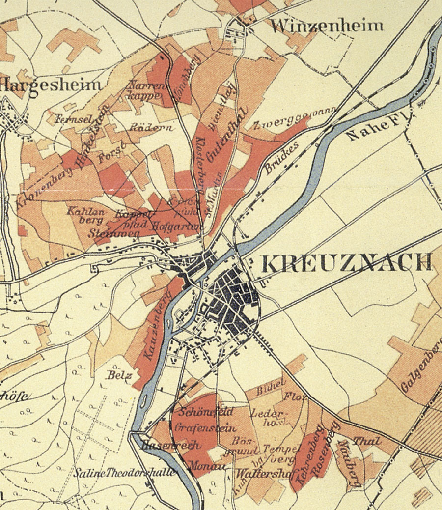 Kreuznach mit seinen Lagen. Ausschnitt aus der historischen Nahe-Weinbau-Karte für den Regierungsbezirk Koblenz aus dem Jahre 1901.