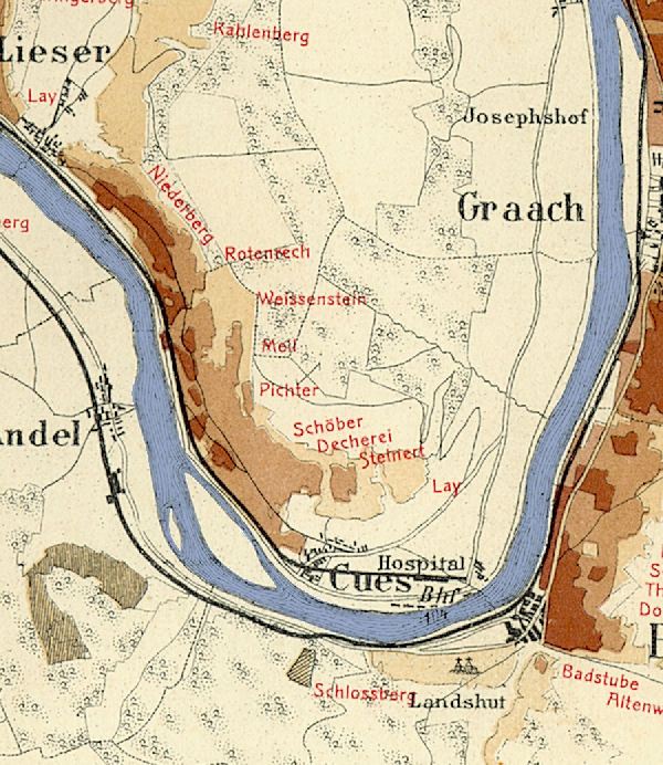 Cues mit seinen Lagen. Ausschnitt aus der historischen Mosel-Weinbau-Karte für den Regierungsbezirk Trier aus dem Jahre 1868.