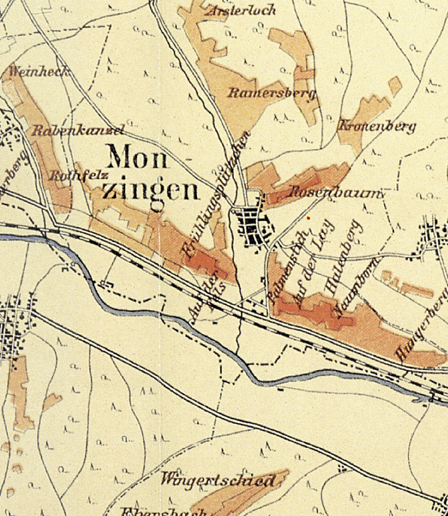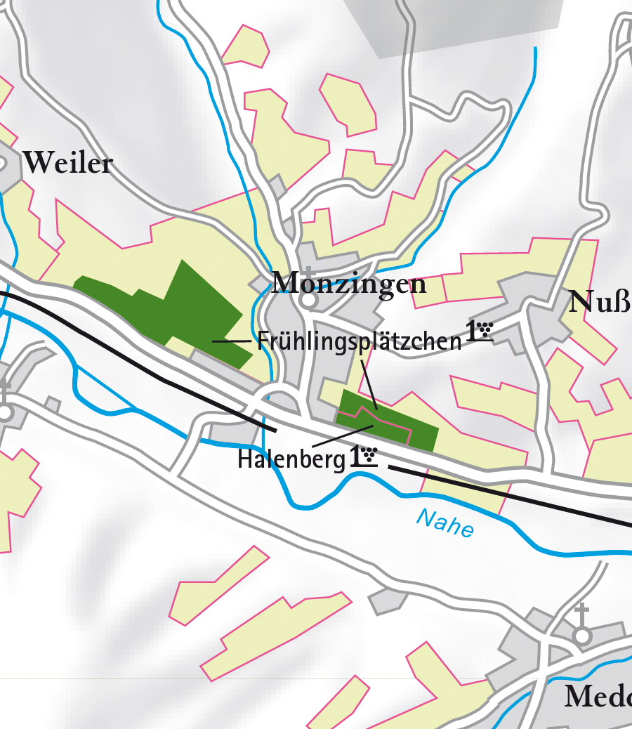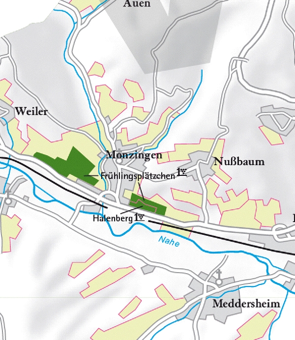 Monzingen mit seinen Lagen. Ausschnitt aus der historischen Nahe-Weinbau-Karte für den Regierungsbezirk Koblenz aus dem Jahre 1901.