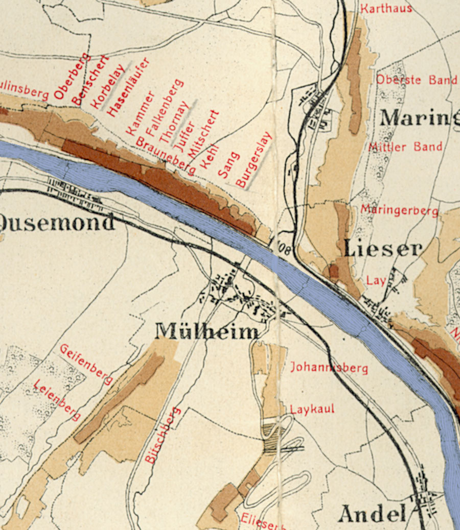Mülheim mit seinen Lagen. Ausschnitt aus der historischen Mosel-Weinbau-Karte für den Regierungsbezirk Trier aus dem Jahre 1868.