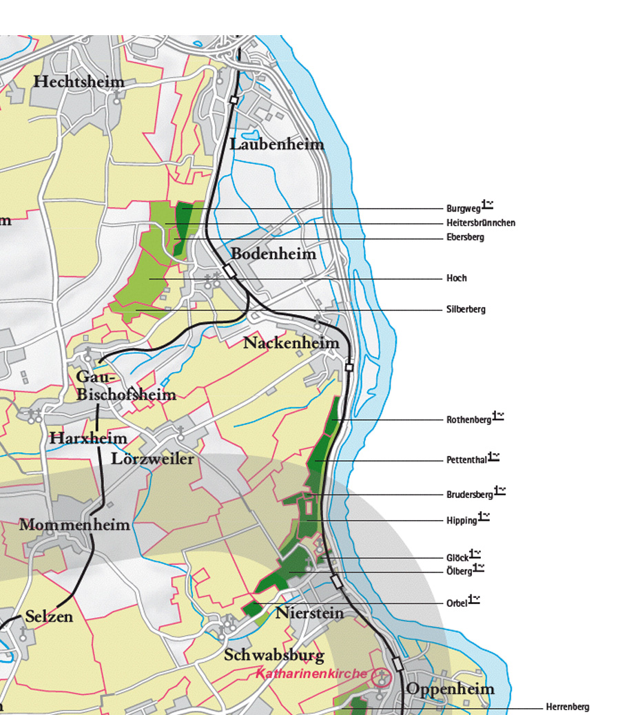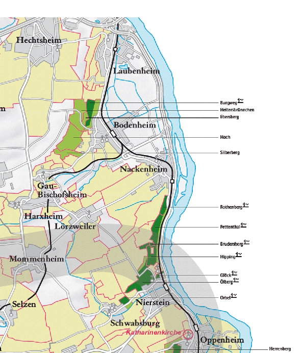 • Die Abbildung zeigt den Ort nackenheim und seine Umgebung mit ihren Ersten Lagen. Ausschnitt aus dem Weinatlas Deutschland. Stand 2009.