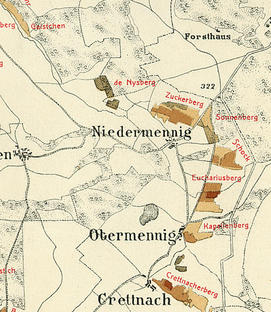 Niedermennig mit seinen Lagen. Ausschnitt aus der historischen Mosel-Weinbau-Karte für den Regierungsbezirk Trier aus dem Jahre 1868.