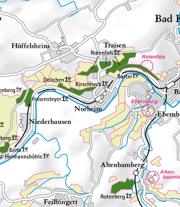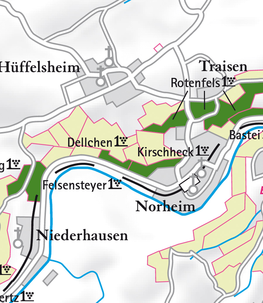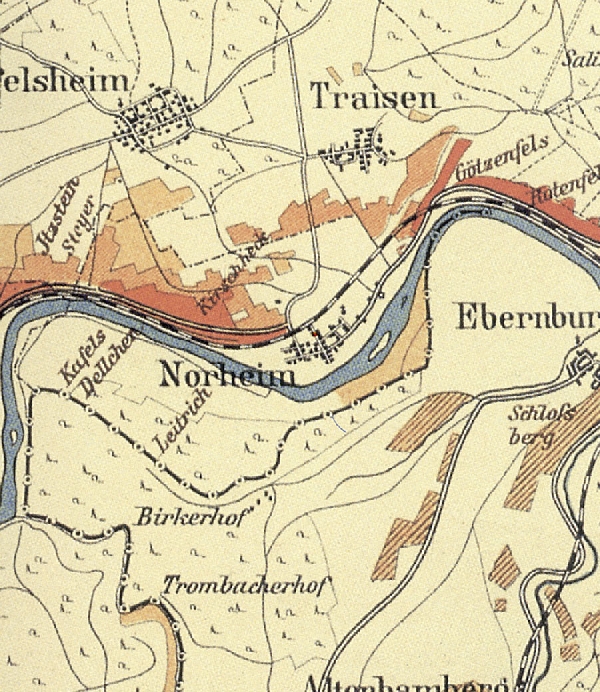 Norheim mit seinen Lagen. Ausschnitt aus der historischen Nahe-Weinbau-Karte für den Regierungsbezirk Koblenz aus dem Jahre 1901.
