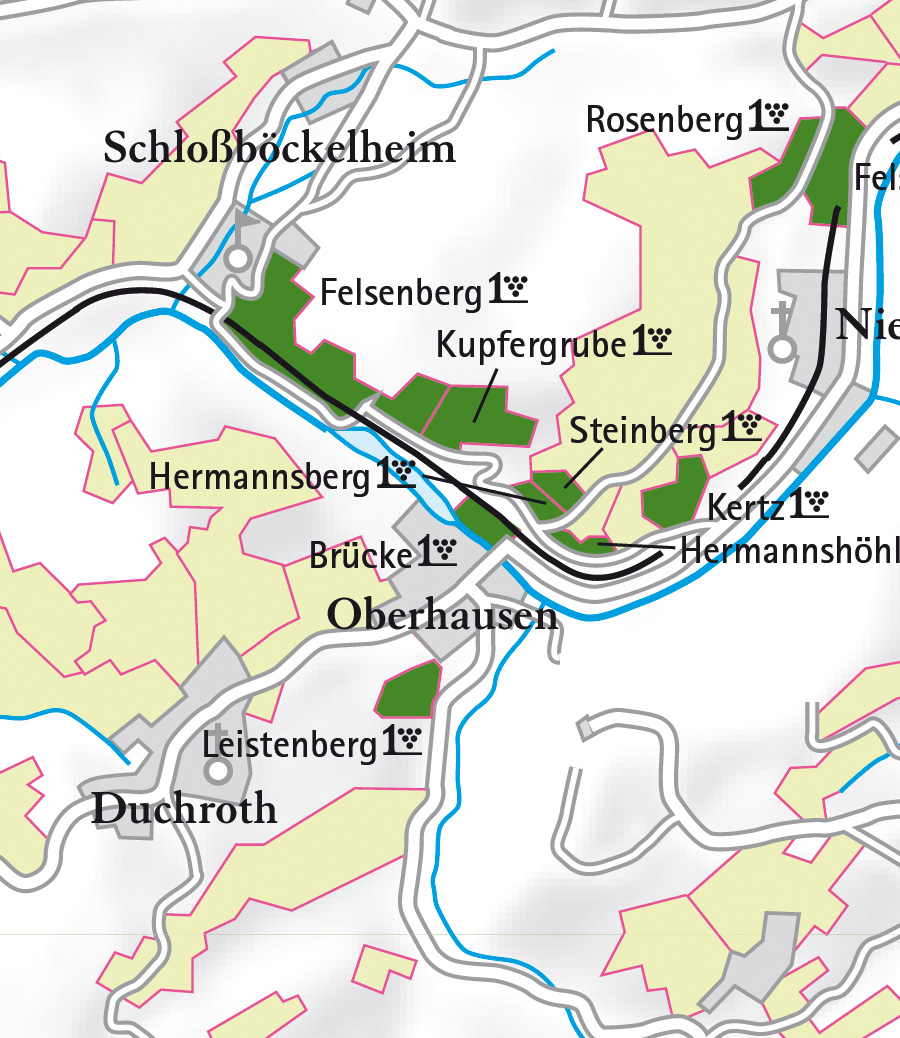 Bei Oberhausen grenzt die Nahe direkt an die Lage Brücke, der Fluss halt somit einen ausgleichenden Effekt auf das Mikroklima. Hinzu kommt noch die sehr windgeschützte Topgrafie der Brücke. Alles das mündet in einer sehr langen und somit gleichmäßigen Vegetationsperiode mit ideal ausreifendem Lesegut