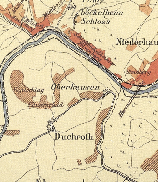 Oberhausen mit seinen Lagen. Ausschnitt aus der historischen Nahe-Weinbau-Karte für den Regierungsbezirk Koblenz aus dem Jahre 1901.