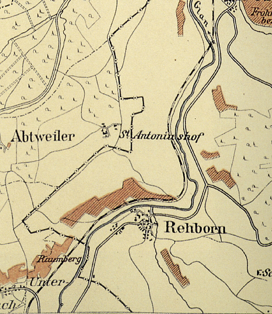 Rehborn mit seinen Lagen. Ausschnitt aus der historischen Nahe-Weinbau-Karte für den Regierungsbezirk Koblenz aus dem Jahre 1901.