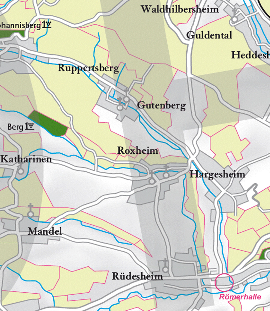Roxheim mit seinen Lagen. Ausschnitt aus der historischen Nahe-Weinbau-Karte für den Regierungsbezirk Koblenz aus dem Jahre 1901.