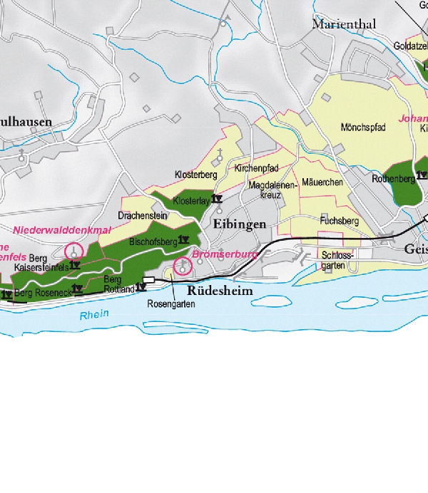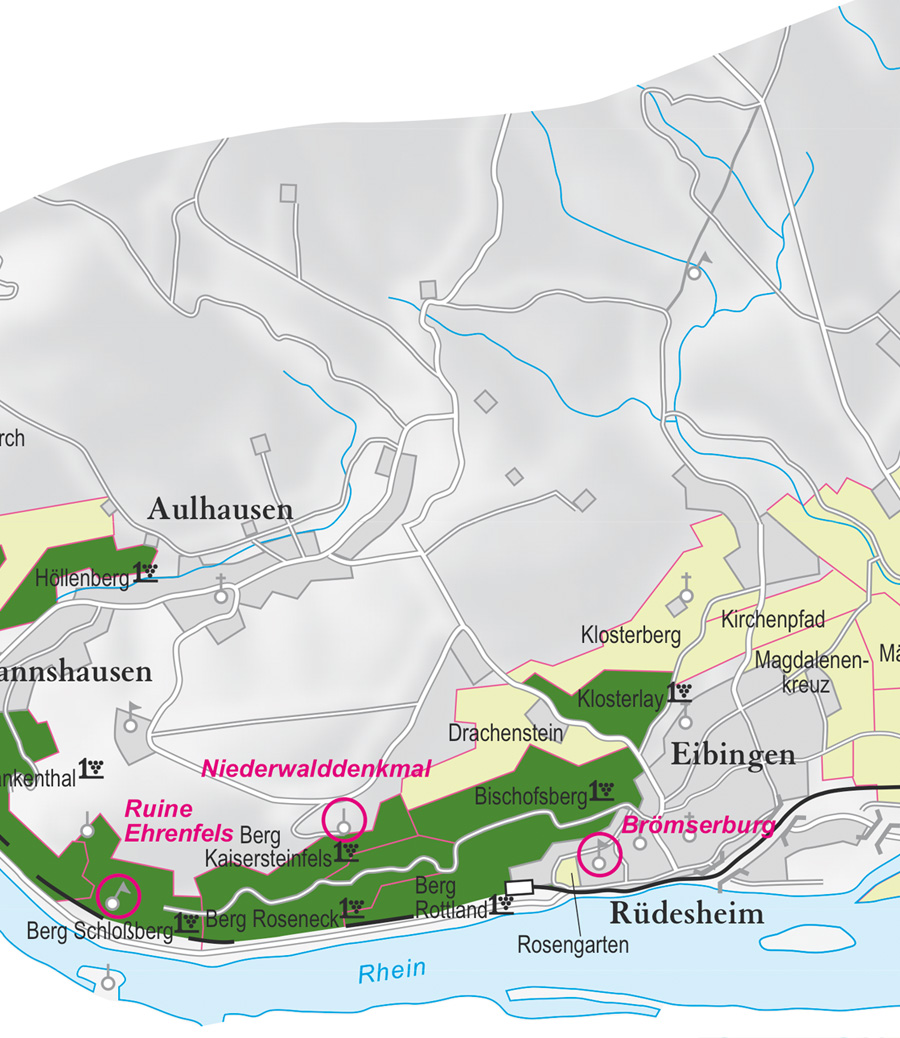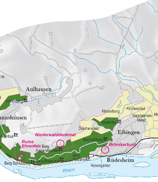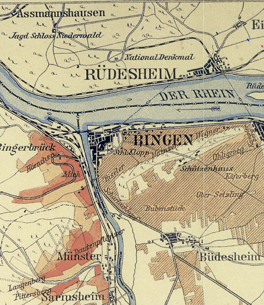 Ruedesheim mit seinen Lagen. Ausschnitt aus der historischen Nahe-Weinbau-Karte für den Regierungsbezirk Koblenz aus dem Jahre 1901.