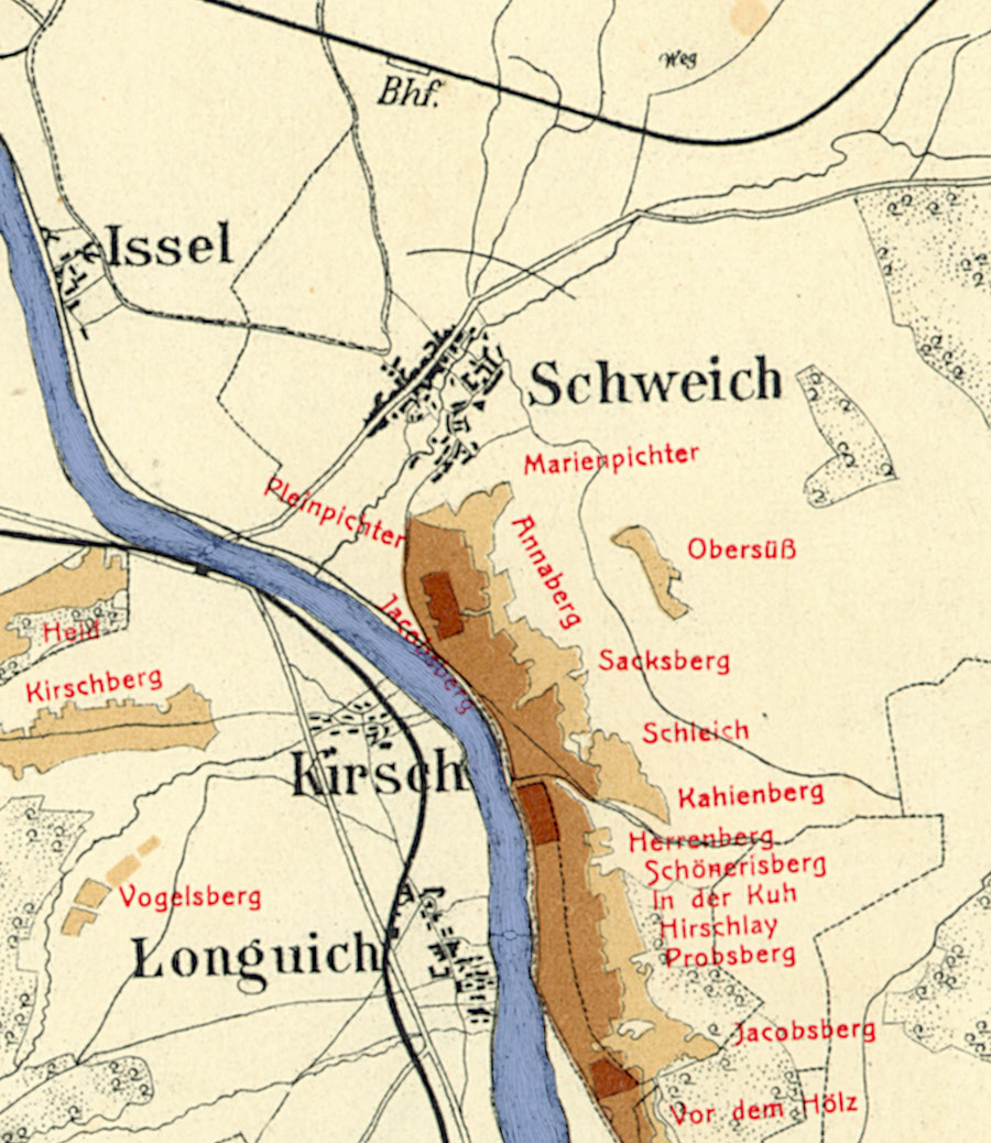 Schweich mit seinen Lagen. Ausschnitt aus der historischen Mosel-Weinbau-Karte für den Regierungsbezirk Trier aus dem Jahre 1906.