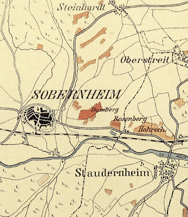 Sobernheim mit seinen Lagen. Ausschnitt aus der historischen Nahe-Weinbau-Karte für den Regierungsbezirk Koblenz aus dem Jahre 1901.