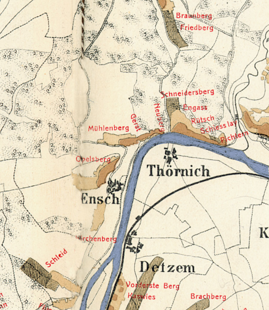 Thörnich mit seinen Lagen. Ausschnitt aus der historischen Mosel-Weinbau-Karte für den Regierungsbezirk Trier aus dem Jahre 1868.