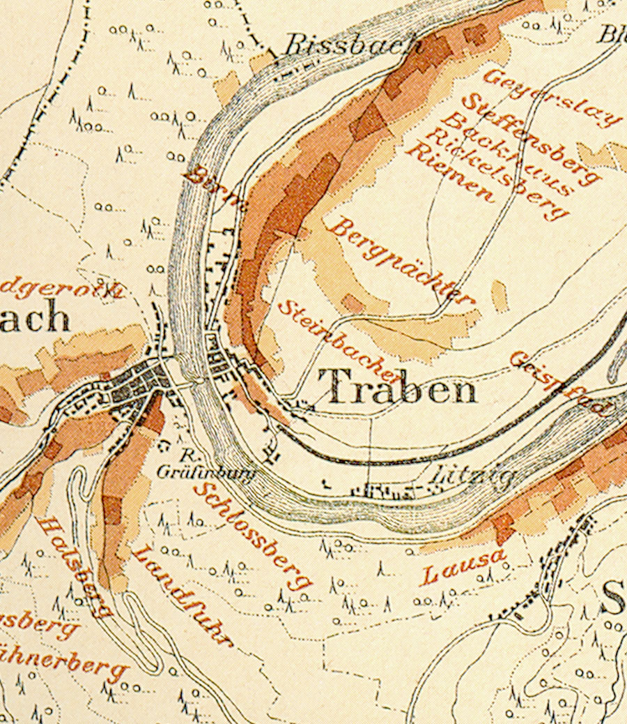 Traben mit seinen Lagen. Ausschnitt aus der historischen Mosel-Weinbau-Karte für den Regierungsbezirk Koblenz aus dem Jahre 1897.
