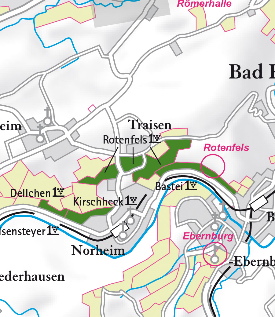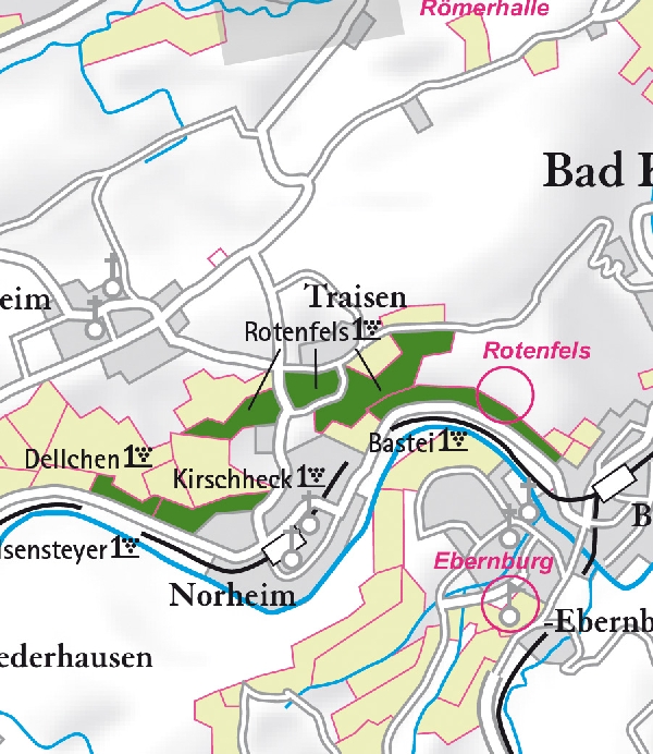 Das beeindruckende Rotenfelsmassiv steht beim Namen dieser Lage Pate. Die Rebflächen sind hier als steiler Südhang ausgeprägt und von einem leicht erwärmbaren und schwach lehmigen Porphyrverwitterungsboden dominiert.