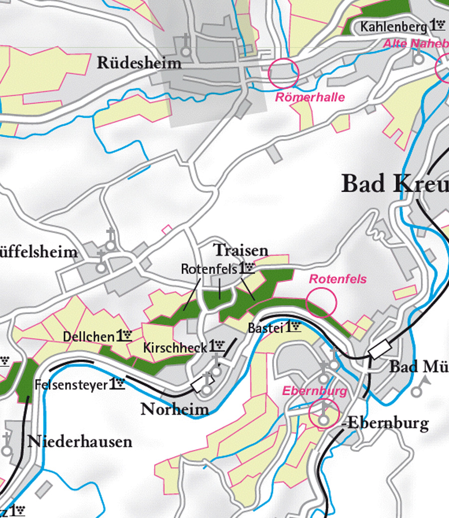 Traisen mit seinen Lagen. Ausschnitt aus der historischen Nahe-Weinbau-Karte für den Regierungsbezirk Koblenz aus dem Jahre 1901.