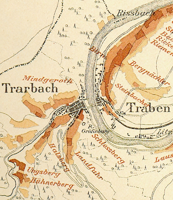 Trarbach mit seinen Lagen. Ausschnitt aus der historischen Mosel-Weinbau-Karte für den Regierungsbezirk Koblenz aus dem Jahre 1897.