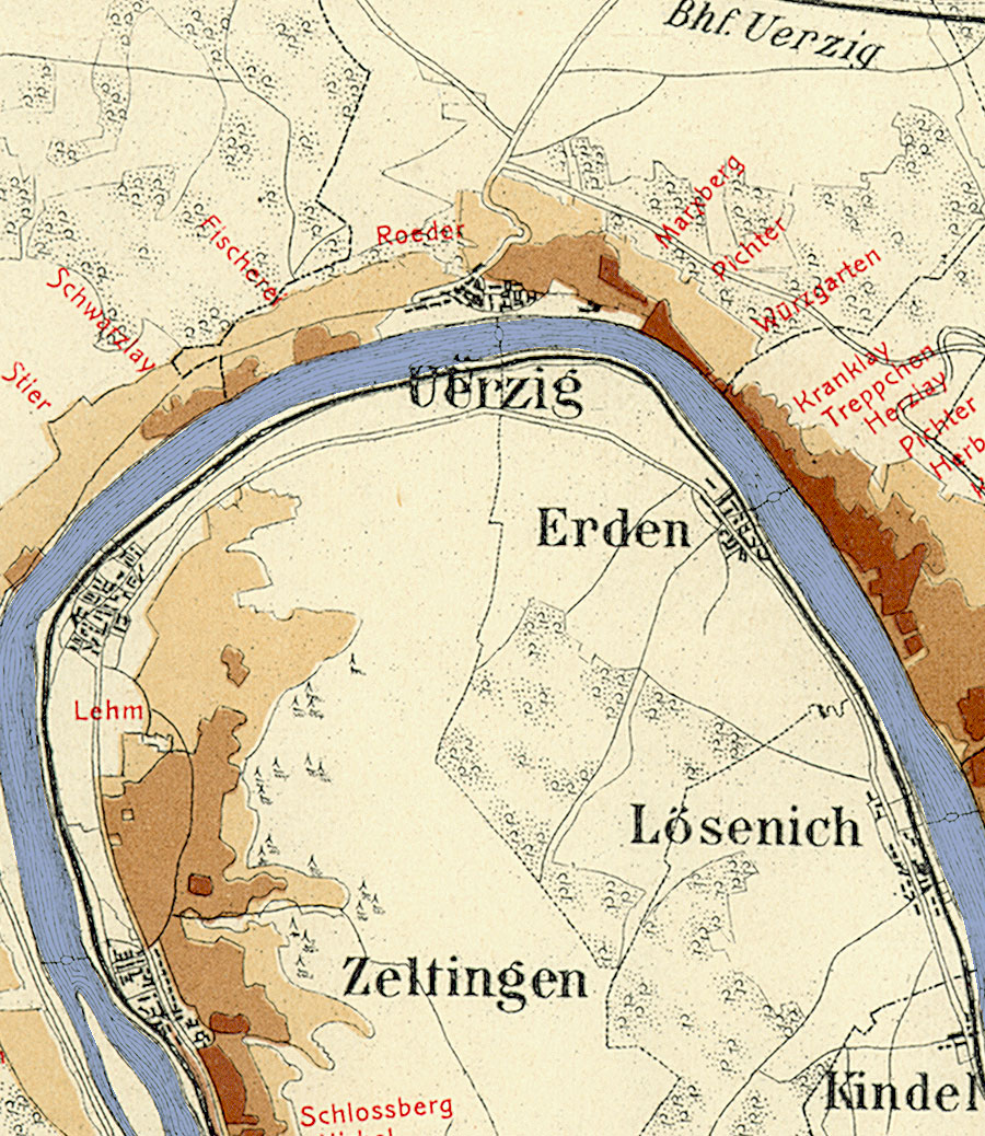 56 ha, ostsüdöstlichee bis südliche Lage, 80% steil, 20% hängig, tiefgründiger, steiniger, frischer Schieferboden und Rotliegendes vulkanischen Ursprungs Kennzeichen: in den Felsen gehauene Sonnenuhr Der rote Vulkan- und Schieferboden (auch Rotliegendes genannt) macht den Ürziger Würzgarten einmalig an der Mosel. Die hier wachsenden Rieslinge sind exotisch-würzig (von feinfruchtig bis üppig) und von großer Tiefe.