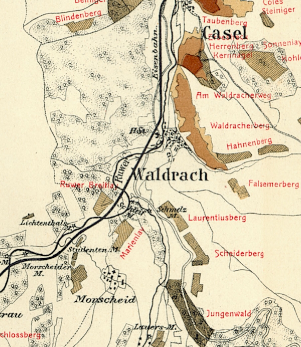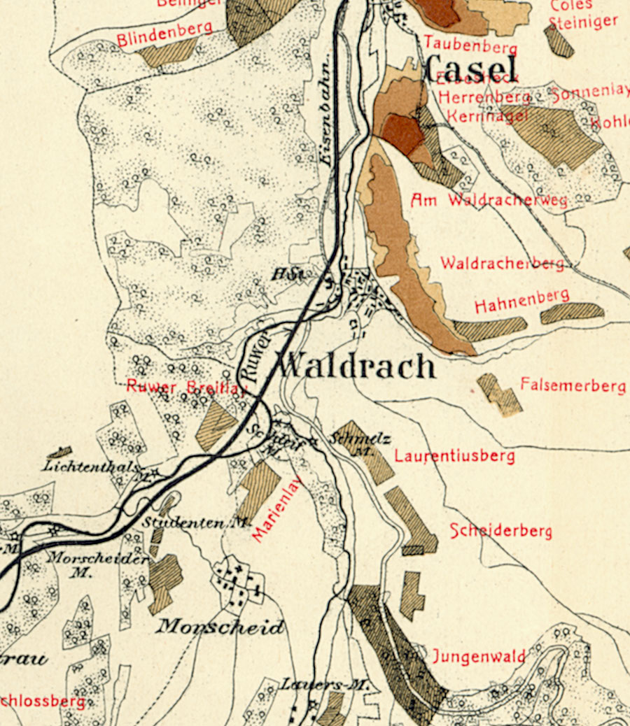 Waldrach mit seinen Lagen. Ausschnitt aus der historischen Mosel-Weinbau-Karte für den Regierungsbezirk Trier aus dem Jahre 1868.