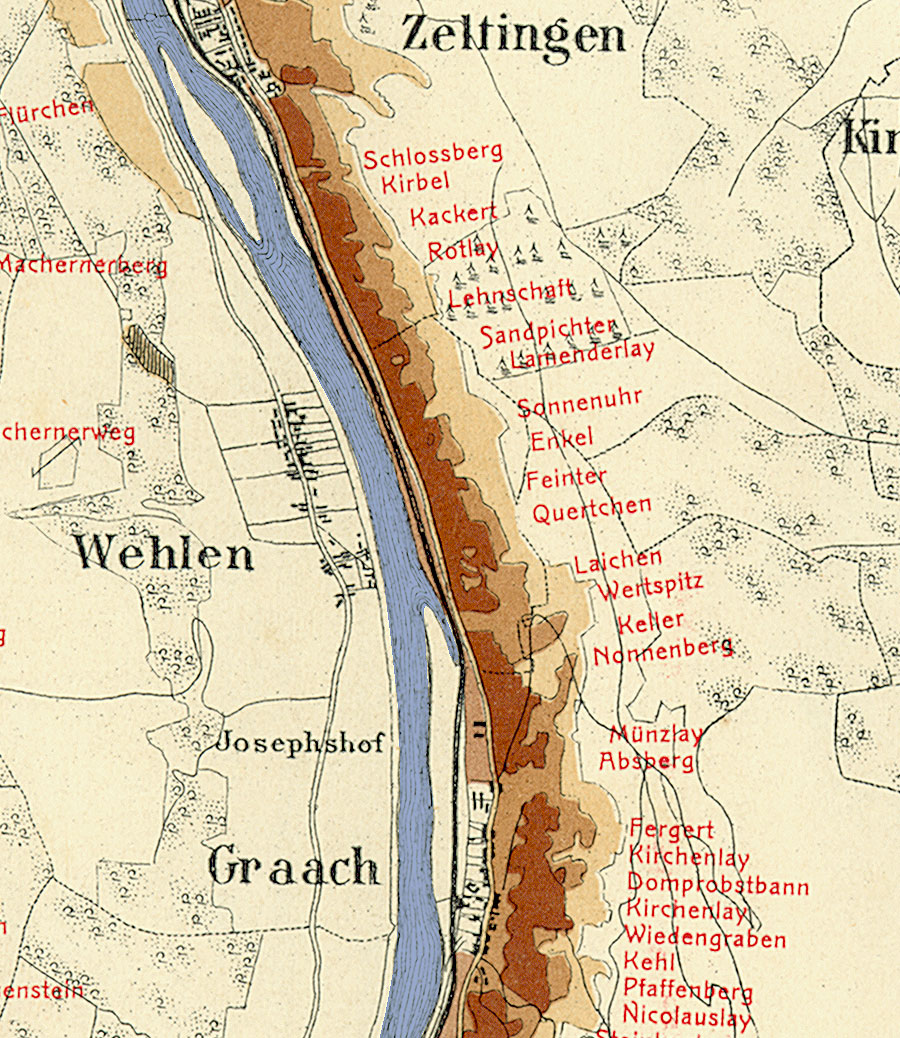 Wehlen mit seinen Lagen. Ausschnitt aus der historischen Mosel-Weinbau-Karte für den Regierungsbezirk Trier aus dem Jahre 1906.