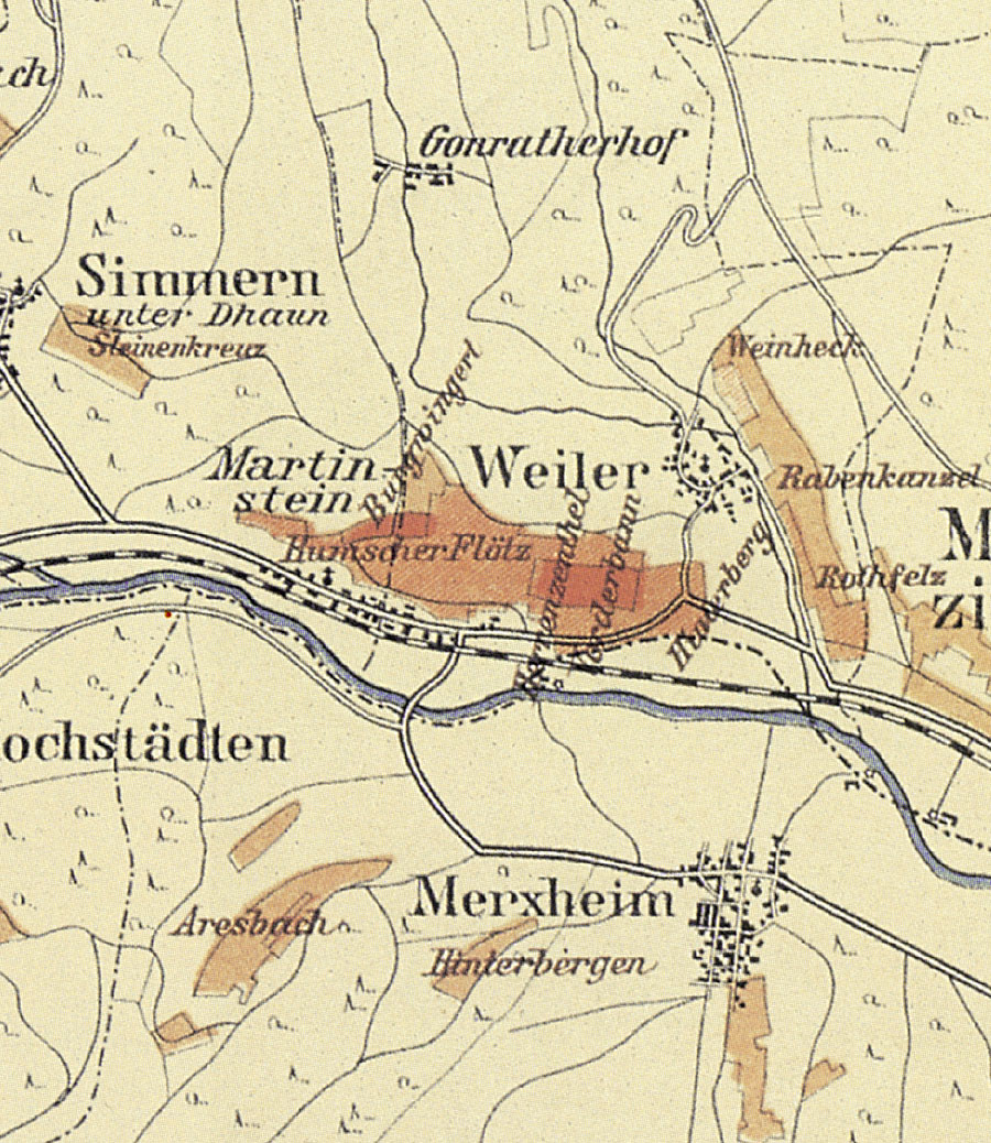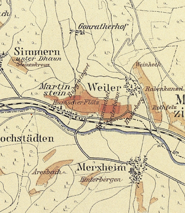 Weiler mit seinen Lagen. Ausschnitt aus der historischen Nahe-Weinbau-Karte für den Regierungsbezirk Koblenz aus dem Jahre 1901.