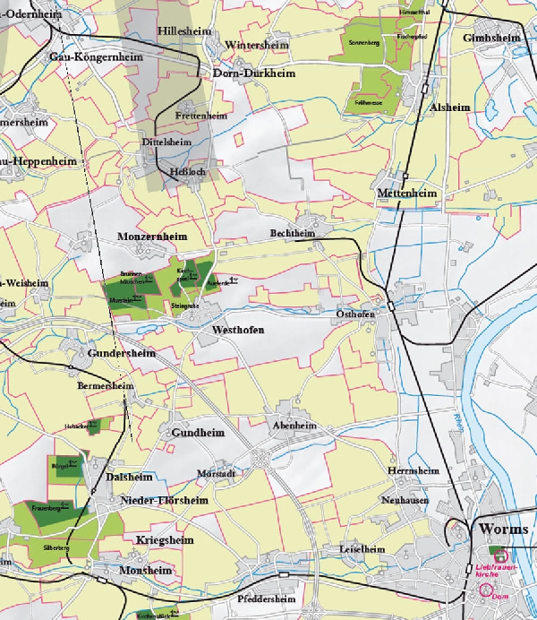 • Diese Abbildung zeigt die Region um den Ort Westhofen mit ihren Ersten Lagen. Ausschnitt der Lagenkarte Rheinhessen. Stand 2009.