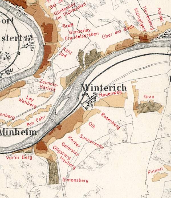 Winterich mit seinen Lagen. Ausschnitt aus der historischen Mosel-Weinbau-Karte für den Regierungsbezirk Trier aus dem Jahre 1906.