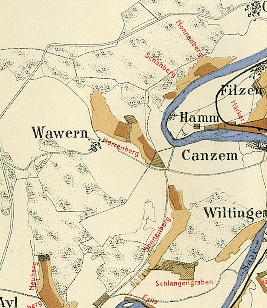 Zur LageDer Ayler Schonfels wurde bereits 1971 mit dem neuen Weingesetz von der Landkarte gefegt, obwohl er zu den markantesten Weinbergen der Saar zu zählen ist.