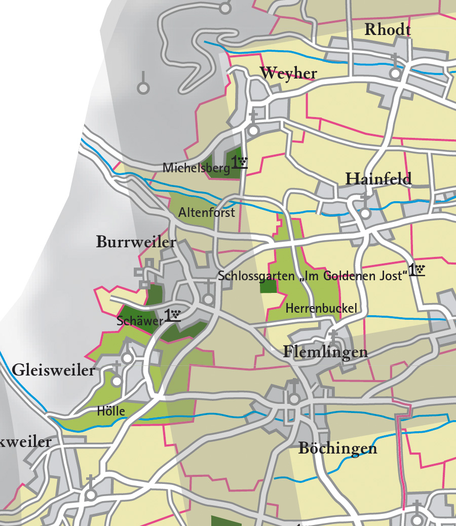 Zur LageAls mit Einführung der Großen Gewächse aber (VDP intern) eine Parzellengenaue Abgrenzung erfolgte, und die Weingüter Kuhn und Knipser in der Parzelle Steinbuckel eines ihrer wichtigsten GG's produzierten, wurde der Name Steinbuckel von diesen auf das Etikett übernommen.