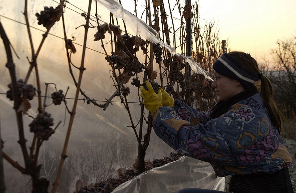 Für die Bereitung der edelsüßen Spezialität muss das Thermometer mindestens minus sieben Grad zeigen, je kälter desto besser. Denn bei tieferen Temperaturen ist der Konzentrationsprozess in den Trauben noch höher. Von der Kelter tropft dann nur der zuckersüße Saft, der größte Teil des Traubenmosts bleibt gefroren als Eiskristall zurück. Entsprechend gering ist die Ausbeute. Nur etwa 5-10 Prozent der ursprünglichen Erntemenge finden sich später als Eiswein in der Flasche wieder.