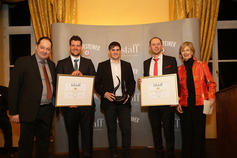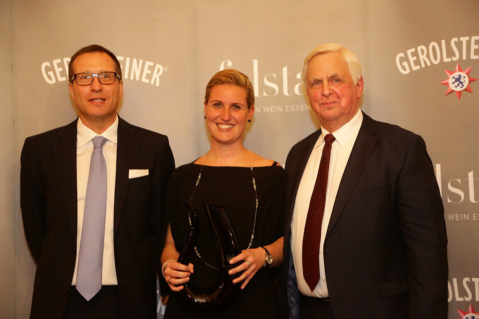 Winzerin des Jahres (v.l).: Falstaff-Herausgeber Christoph Teuner, Carolin Spanier-Gillot und Laudator Heiner Bremer (n-tv-Kommentator).