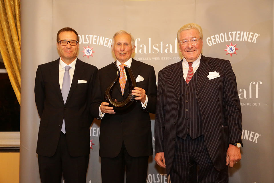 Falstaff-Herausgeber Christoph Teuner (l.) mit Dr. Heinrich Wirsching, der für sein Lebenswerk geehrt wurde (Mitte). Rechts: Laudator Dr. Jens-Jürgen Böckel (Generalbevollmächtigter Tengelmann).