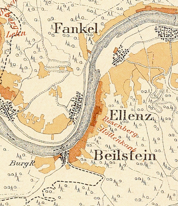 Ellenz mit seinen Lagen. Ausschnitt aus der historischen Mosel-Weinbau-Karte für den Regierungsbezirk Koblenz aus dem Jahre 1897.