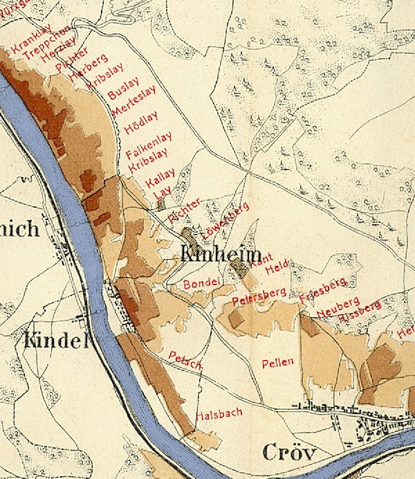 Kinheim mit seinen Lagen. Ausschnitt aus der historischen Mosel-Weinbau-Karte für den Regierungsbezirk Trier aus dem Jahre 1906.