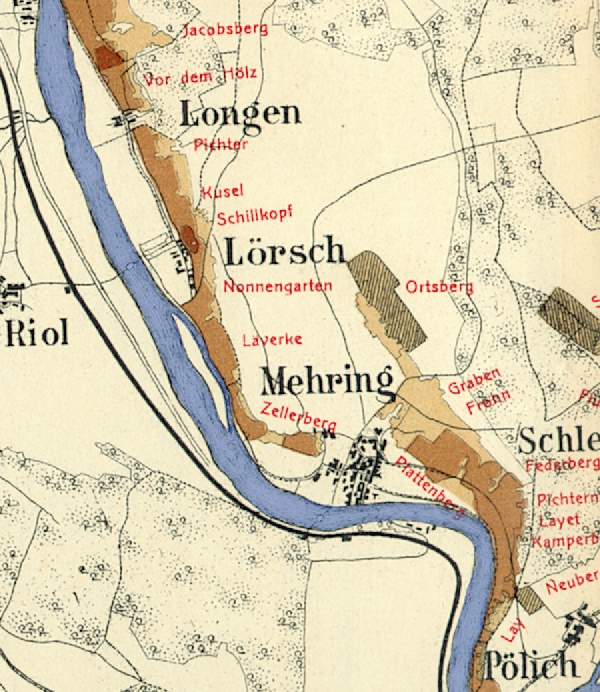 Mehring mit seinen Lagen. Ausschnitt aus der historischen Mosel-Weinbau-Karte für den Regierungsbezirk Trier aus dem Jahre 1906.