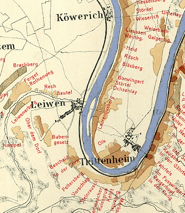 Leiwen mit seinen Lagen. Ausschnitt aus der historischen Mosel-Weinbau-Karte für den Regierungsbezirk Trier aus dem Jahre 1906.