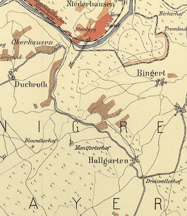 Hallgarten mit seinen Lagen. Ausschnitt aus der historischen Nahe-Weinbau-Karte für den Regierungsbezirk Koblenz aus dem Jahre 1901.