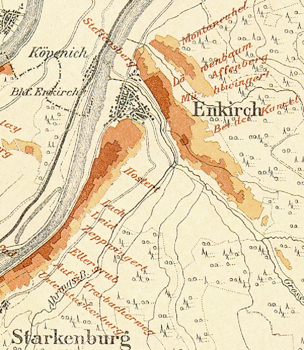 Enkirch mit seinen Lagen. Ausschnitt aus der historischen Mosel-Weinbau-Karte für den Regierungsbezirk Koblenz aus dem Jahre 1897.